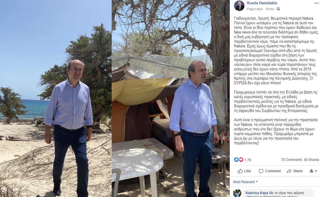«Πολλοί έχουν «κλάψει» για τις Natura σε αυτό τον τόπο. Είναι οι ίδιοι περίπου που έχουν διαδώσει και fake news όλο το τελευταίο διάστημα ότι δήθεν εμείς, η δική μας κυβέρνηση με τον πρόσφατο περιβαλλοντικό νόμο, πάμε να καταστρέψουμε τις Natura. Εμείς όμως είμαστε που θα τις προστατεύσουμε!» αναφέρει, μεταξύ άλλων, σε μία ακόμα ανάρτησή του στην δραστήρια σελίδα του στα κοινωνικά δίκτυα ο Κωστής Χατζηδάκης, λίγα μόλις εικοσιτετράωρα από την μεγάλη κινητοποίηση της περασμένης Παρασκευής εναντίον του αντιπεριβαλλοντικού νομοσχεδίου που εν μέσω πανδημίας θέσπισε η κυβέρνηση Μητσοτάκη.