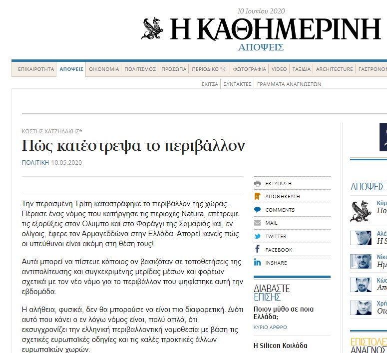 «Την περασμένη Τρίτη καταστράφηκε το περιβάλλον της χώρας. Πέρασε ένας νόμος που κατάργησε τις περιοχές Natura, επέτρεψε τις εξορύξεις στον Ολυμπο και στο Φαράγγι της Σαμαριάς και, εν ολίγοις, έφερε τον Αρμαγεδδώνα στην Ελλάδα. Απορεί κανείς πώς οι υπεύθυνοι είναι ακόμη στη θέση τους!» ανέφερε μεταξύ άλλων, υποστηρίζοντας πως «μπορεί να πίστευε κάποιος αν βασιζόταν σε τοποθετήσεις της αντιπολίτευσης και συγκεκριμένης μερίδας μέσων και φορέων σχετικά με τον νέο νόμο για το περιβάλλον που ψηφίστηκε αυτή την εβδομάδα», και κατηγορώντας και πάλι «κάποιους» πως «επέλεξαν να διαστρεβλώσουν το περιεχόμενο του νομοσχεδίου λόγω συγκεκριμένων συμφερόντων ή λόγω άγνοιας του αντικειμένου».