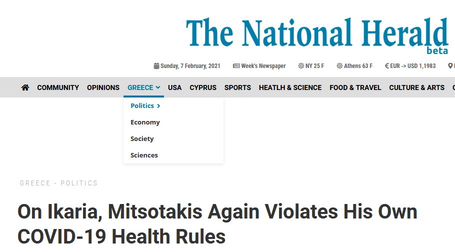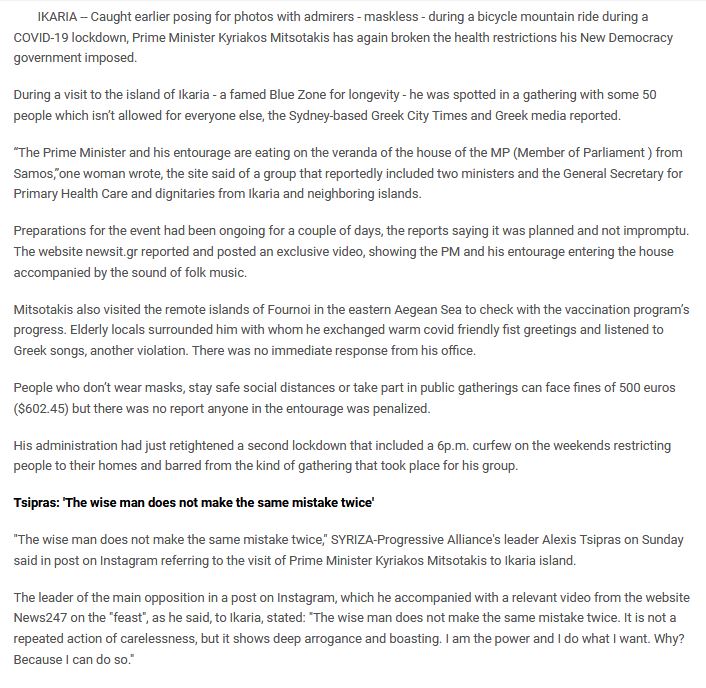 Ειδικότερα, υπάρχουν αναφορές για τον συγχρωτισμό παρουσία του πρωθυπουργού σε σπίτι στην Ικαρία, σε ένα αντιθετικό σχήμα: ότι αν αυτά τα έκαναν απλοί πολίτες, τότε θα αντιμετώπιζαν πρόστιμα, κάτι «που δεν έγινε με τους παρευρισκόμενους στην Ικαρία».