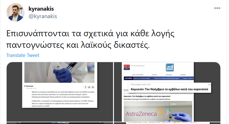 - Ένα άρθρο του ANT1 με ανώνυμη πηγή έναν «ευρωπαίο αξιωματούχο της Κομισιόν» για εμβόλιο τον Νοέμβριο