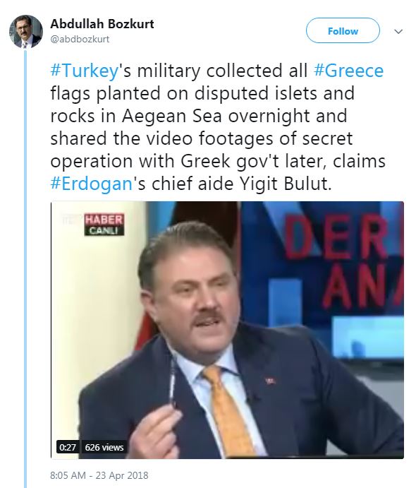 Μιλώντας σε τουρκικό κανάλι, ο σύμβουλος του Τούρκου Προέδρου, Γιγκίτ Μπουλούτ, υποστήριξε πως «ο τουρκικός στρατός κατέβασε μέσα σε ένα βράδυ όλες τις ελληνικές σημαίες που είχαν τοποθετηθεί σε αμφισβητούμενες βραχονησίδες στο Αιγαίο».