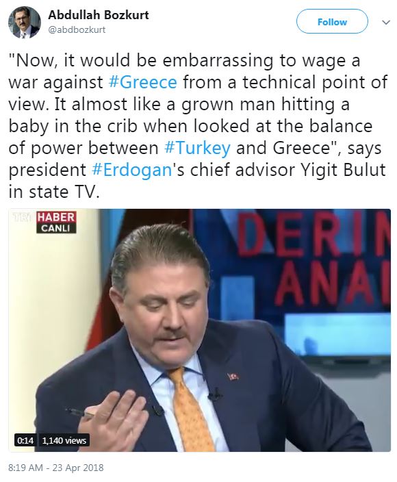 Επίσης, ο Τούρκος προχώρησε σε μία ακόμη προκλητική δήλωση, αναφέροντας πως ένας πόλεμος της Τουρκίας εναντίον της Ελλάδας θα ήταν ντροπιαστικός, «σαν ένας ενήλικας να χτυπάει ένα μωρό παιδί στην κούνια, αν αναλογιστεί κανείς τη σύγκριση των στρατιωτικών δυνάμεων των δύο χωρών».