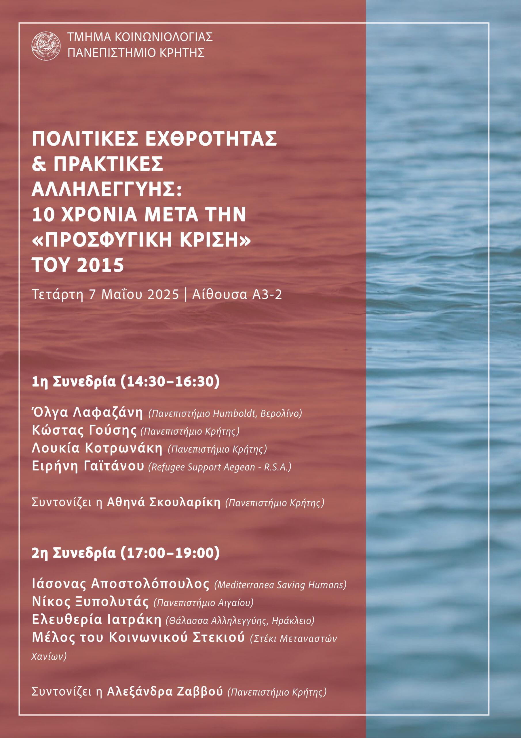 Το Τμήμα Κοινωνιολογίας του Πανεπιστημίου Κρήτης διοργανώνει ημερίδα με θέμα: Πολιτικές εχθρότητας & πρακτικές αλληλεγγύης: Δέκα χρόνια μετά την «προσφυγική κρίση» του 2015. Η ημερίδα θα πραγματοποιηθεί την Τετάρτη 7 Μαΐου 2025, στην Αίθουσα Α3-2 του Τμήματος Κοινωνιολογίας.