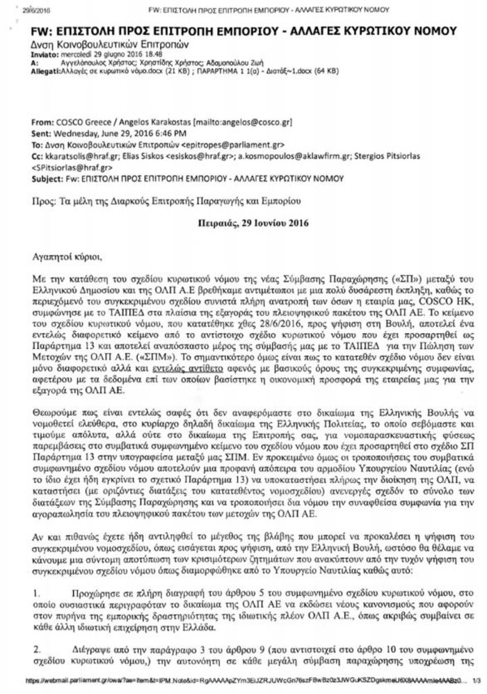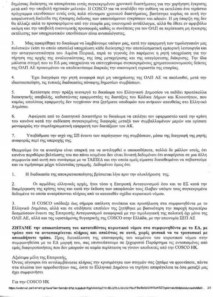 Στην επιστολή της η κινεζική εταιρεία ζητά  την αποκατάσταση του κατατεθέντος κυρωτικού νόμου στα συμφωνηθέντα με το ελληνικό δημόσιο με τρόπο που να ανταποκρίνεται πλήρως και απολύτως σε αυτά χωρίς να τα τροποποιεί με οποιοδήποτε τρόπο.