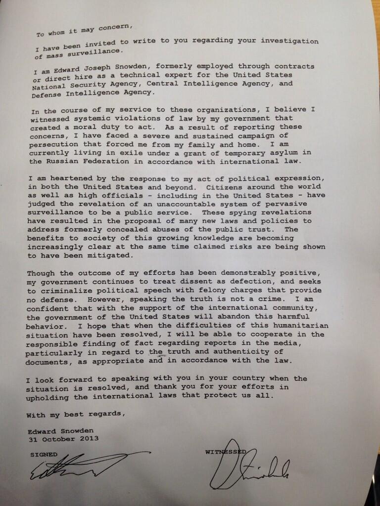 Η επιστολή που πήρε από τον Σνόουντεν θα παραδοθεί την Παρασκευή και μετά την παράδοσή της, ο Στρόμπελε προανήγγειλε πως θα δώσει σε συνέντευξη Τύπου διευκρινίσεις και περισσότερες πληροφορίες.