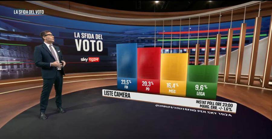 Στην κάλπη για το κοινοβούλιο, σύμφωνα με το exit poll που παρουσίασε το τοπικό Sky Tg24, πρώτοι έρχονται οι «Αδελφοί της Ιταλίας» της Μελόνι, με το γνωστό φασιστικό παρελθόν, καθώς φαίνεται να λαμβάνουν 23,5%, ενώ ακολουθεί το Δημοκρατικό Κόμμα με 20,3%. Το Κίνημα των Πέντε Αστέρων φέρεται να παίρνει 16,4% ενώ η Λέγκα ακολουθεί στην τέταρτη θέση με 9,6%.