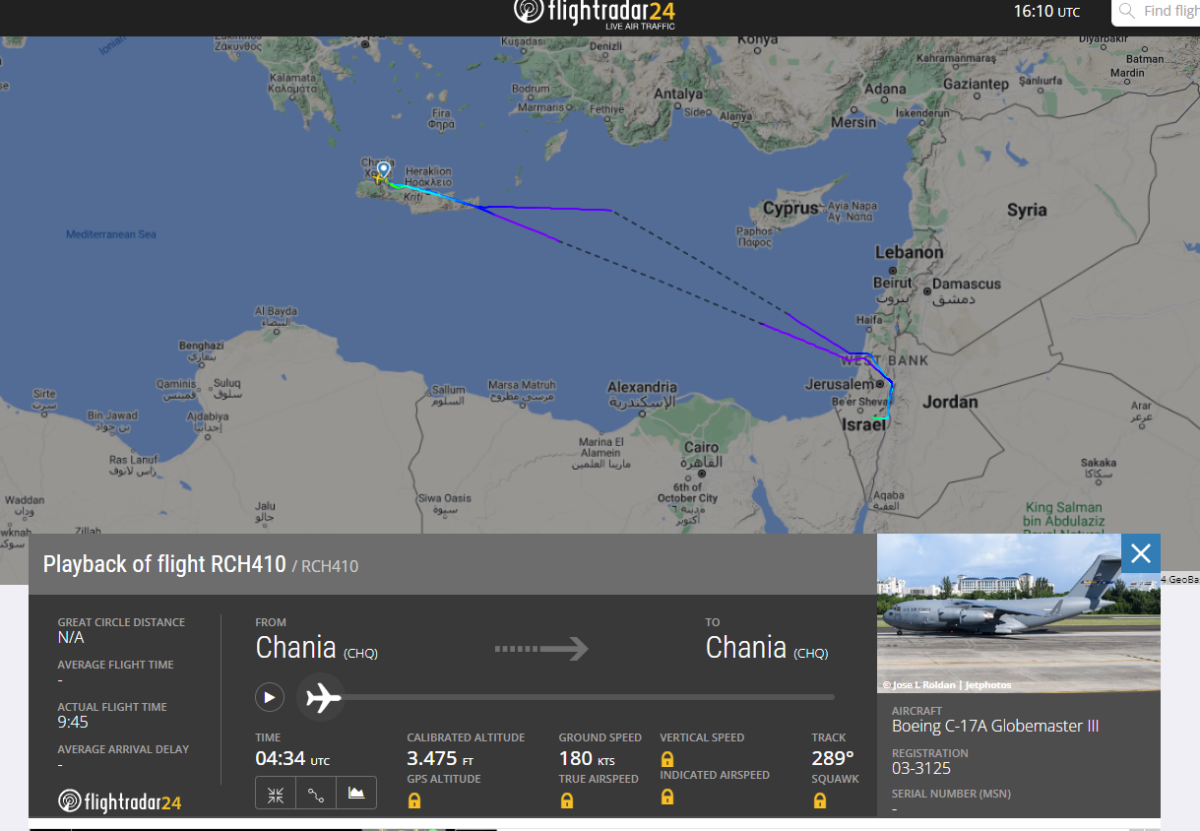 Συγκεκριμένα, αεροσκάφος τύπου C-17Α Globemaster III,, το οποίο σύμφωνα με τα ανοιχτά δεδομένα που προσφέρει η υπηρεσία FlightRadar βρισκόταν στις ΗΠΑ τουλάχιστον μέχρι τις 24 Μαΐου, προσγειώθηκε στη Ρότα της Ισπανίας στις 26 Μαΐου και την ίδια ημέρα μετέβη στη βάση της Σούδας. Τα ίδια στοιχεία δείχνουν ότι σήμερα Δευτέρα 27/5 το αεροσκάφος με αριθμό RCH410 μετέβη στο Ισραήλ, χωρίς ωστόσο να έχει καταγραφεί κάποια στάση και φαίνεται να επιστρέφει στη Σούδα ύστερα από περίπου 9 ώρες.