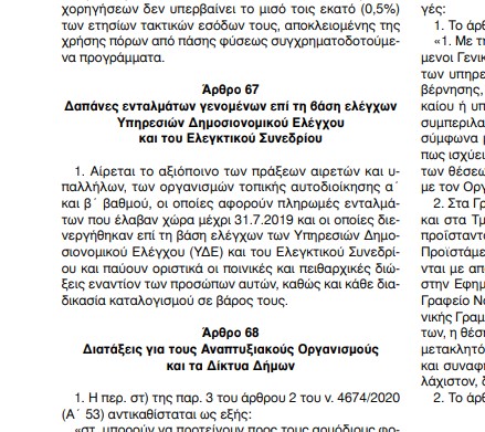 Μεταξύ των διατάξεων που ψηφίστηκαν και αποτελούν πλέον νόμο του κράτους, αίσθηση προκαλεί άρθρο που φέρεται να ψηφίστηκε από τη Νέα Δημοκρατία, τον ΣΥΡΙΖΑ και το ΚΚΕ, και προβλέπει την άρση του αξιόποινου των πράξεων δημάρχων, περιφερειαρχών και υπαλλήλων Δήμων και Περιφερειών, και την παύση ποινικών και πειθαρχικών διώξεων εναντίον τους, αναφορικά με πληρωμές ενταλμάτων που ελέγχθηκαν από υπηρεσίας δημοσιονομικού ελέγχου και Ελεγκτικού Συνεδρίου. Ακόμα πιο προκλητικά, οι υποθέσεις που «καθαρίζουν» αφορούν την περίοδο μέχρι και την 31η Ιουλίου του 2019.