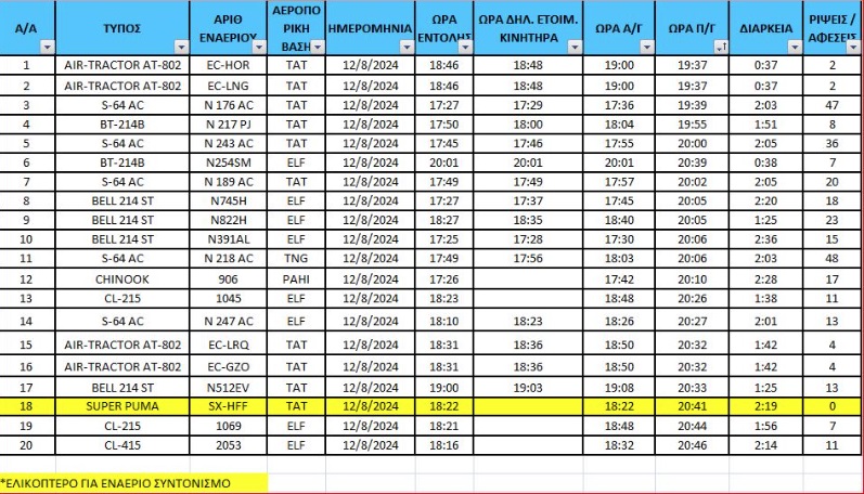 – Στις 12 Αυγούστου: 36 εναέρια μέσα (17 αεροσκάφη και 19 ελικόπτερα)