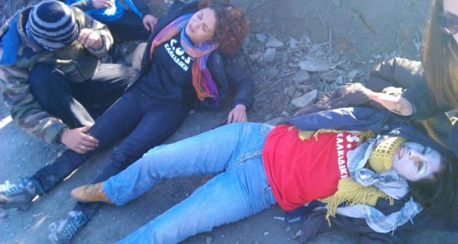 «Την Τετάρτη 19/2/2014 δύο γυναίκες τραυματίστηκαν από δυνάμεις της Αστυνομίας, ενώ μετά από βίαιη επέμβαση των αρχών στις Σκουριές, έγιναν και δύο προσαγωγές, μετά από καθιστική διαμαρτυρία των πολιτών που αντιδρούν στη μεταφορά φορτίων της εταιρείας «Ελληνικών Χρυσός» από την περιοχή. Συγκεκριμένα, οι κάτοικοι απέκλεισαν τον δρόμο που οδηγεί στο εργοτάξιο της εταιρείας, στην τοποθεσία Χονδρό Δέντρο, με την αστυνομία και τα ΜΑΤ να παρεμβαίνουν με βίαιο τρόπο, τραβώντας και βρίζοντας τις γυναίκες, προκειμένου να περάσουν τα οχήματα που μετέφεραν τους εργαζομένους της εταιρείας. Από τα επεισόδια, ένας άνδρας, καρδιοπαθής, μεταφέρθηκε στο κέντρο υγείας Παλαιοχωρίου, όπως και μία γυναίκα που είχε χτυπηθεί στο χέρι και τα νεφρά, η οποία στη συνέχεια μεταφέρθηκε στον Πολύγυρο. Ακόμα μία γυναίκα τραυματίστηκε στο πόδι», προσθέτουν.