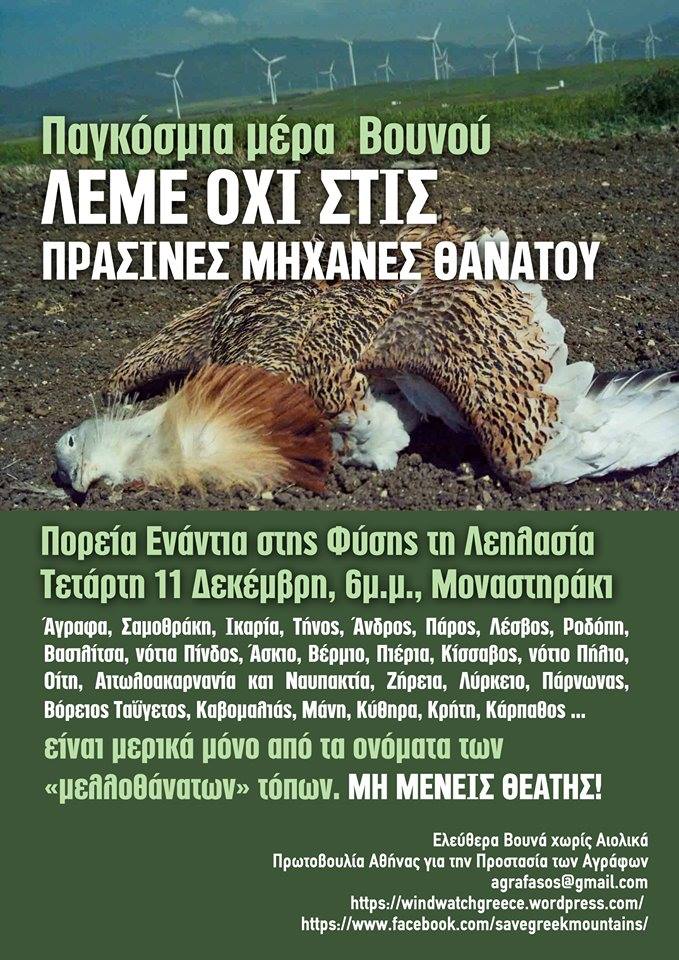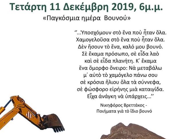 Συγκέντρωση-Πορεία, ενάντια στης Φύσης τη λεηλασίαΤις πονάμε και εμείς τις κορυφές και δε θα σκύψουμε το κεφάλι. Απέναντι στον βιασμό της φύσης, προς όφελος των λίγων και ισχυρών, δε θα παραμείνουμε απλοί παρατηρητές/συνένοχοι.