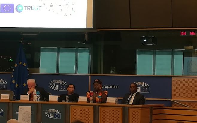 Στιγμιότυπο από τη συζήτηση με τη συμμετοχή της sex worker Τζόις Αντιάμπο-Οντιάμπο από την Κένυα, της ακτιβίστριας Λεάνα Σνάιντερς από τη Νότιο Αφρική, του ερευνητή Μάικλ Μακάνγκα από την Ουγκάντα, υπό το βλέμμα του Κλάους Λέζινγκερ, κατά την εκδήλωση της Ευρωπαϊκής Αριστεράς «Ethics Dumping: Looking for Justice» στο ευρωκοινοβούλιο στις 29 Ιουνίου 2018.