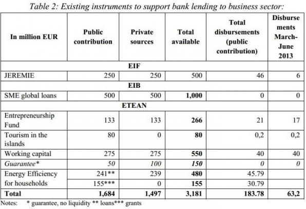 The dire condition in which businesses find themselves when it comes to access to bank lending, become evident in a table titled “Existing instruments to support bank lending to business sector” (table 2, pp. 18-19 of the report).