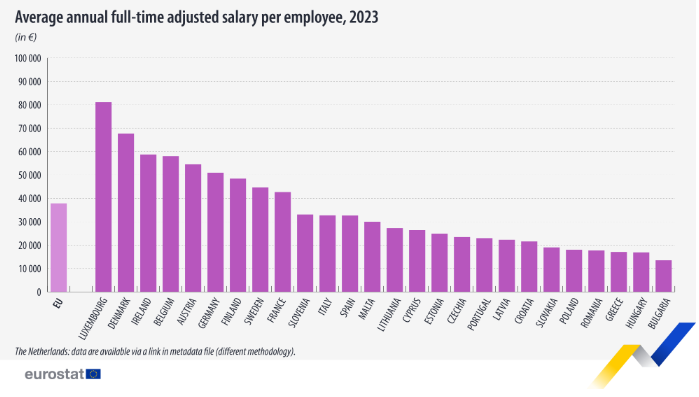 Across the EU, average salaries rose in 2023. The adjusted full-time salary across member states reached €37,900, marking a 6.5% increase from €35,600 in 2022.