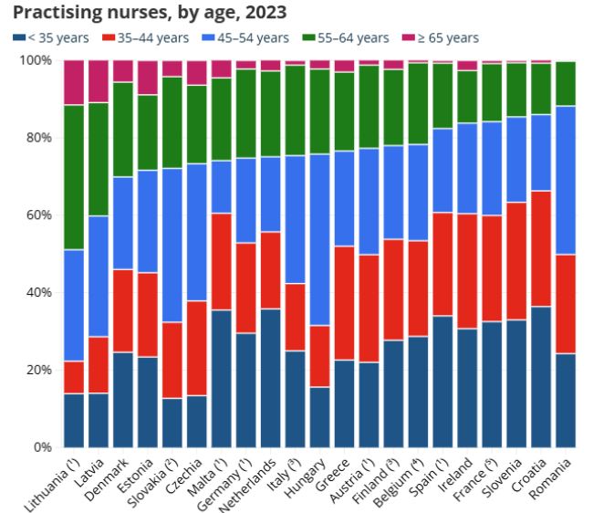 Η κρίση στο ανθρώπινο δυναμικό δεν αφορά μόνο τον αριθμό, αλλά και τη σύνθεση του προσωπικού. Σε πολλές χώρες της ΕΕ, το ποσοστό των νοσηλευτών ηλικίας 55 ετών και άνω ξεπερνά το 30%, με τη Λιθουανία και τη Λετονία να φτάνουν ακόμη και πάνω από 40%.