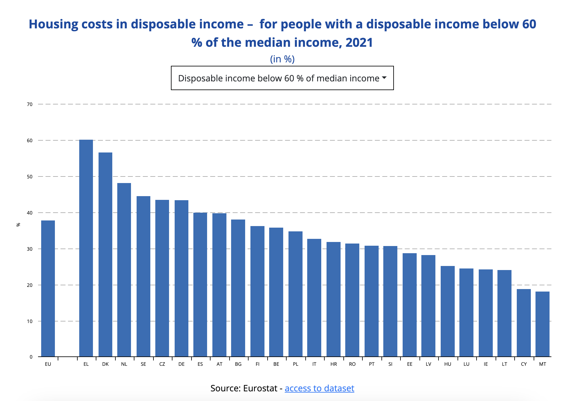 Το 2021, το μερίδιο του κόστους στέγασης στο διαθέσιμο εισόδημα ήταν κατά μέσο όρο 19% στην ΕΕ, ενώ ειδικά για τα άτομα που βρίσκονται σε κίνδυνο φτώχειας το μερίδιο αυτό ήταν 38%.