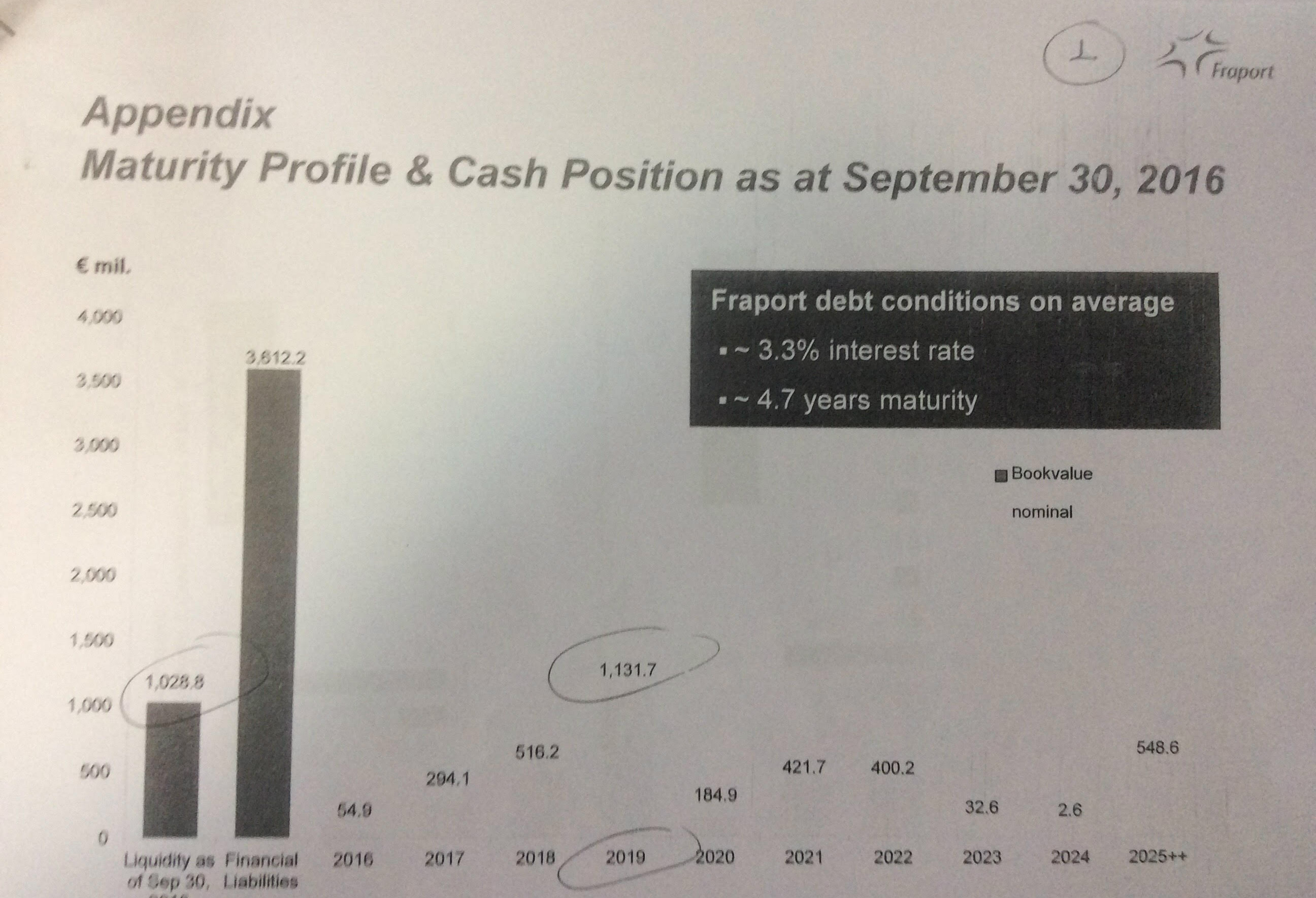Το πρώτο έγγραφο που παρουσιάζει σήμερα το TPP αφορά την οικονομική κατάσταση της Fraport, σύμφωνα με τα τελευταία επίσημα δημοσιευμένα στοιχεία της εταιρείας που φτάνουν μέχρι τις 30 Σεπτεμβρίου 2016. Η ρευστότητα της Fraport, η δυνατότητά της να ανταποκρίνεται στις πληρωμές της, ανέρχεται στο 1 δις. ευρώ. Το χρέος της εταιρείας όμως αγγίζει τα 3,6 δισ. ευρώ, ενώ μάλιστα ένα σημαντικό μέρος των υποχρεώσεων πληρωμών της εταιρείας αφορούν την περίοδο 2017-2021, διάστημα στο οποίο η Fraport έχει υποσχεθεί «επενδύσεις 330-400 εκατ. ευρώ» στα 14 αεροδρόμια. Η ρευστότητα και τα χρέη της εταιρείας αποτυπώνονται στο παρακάτω γράφημα: