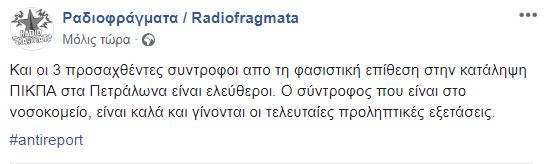 Σήμερα 8:20 μμ η κατάληψη πρώην ΠΙΚΠΑ, την ώρα που η ανοιχτή συνέλευση κατοίκων Πετραλώνων Θησείου Κουκακίου πραγματοποιούσε συνέλευση , δέχτηκε επίθεση από ομάδα φασιστών. Οι φασίστες ήταν περίπου 30, κουκουλομενοι, σπάσαν τζάμια, πέταξαν πέτρες και μολότοφ και φώναζαν “Πουτανας γιοι αναρχικοί θα πεθάνετε ” . Όταν βγήκαν οι σύντροφοι για να τους κυνηγήσουν, απομόνωσαν έναν και τον χτύπησαν στο κεφάλι με αλυσίδες με αποτέλεσμα αυτή την στιγμή να βρίσκεται στο νοσοκομείο με σοβαρά τραύματα . Επίσης όταν κάποιο σύντροφοι τους κυνήγησαν απωθοντας τους, ήρθαν ΔΙΑΣ ΟΠΚΕ και περιπολικό και προσηγαγαν τρεις από τους συντρόφους. Αυτή την στιγμή οι σύντροφοι είναι στην γαδα. Σε λίγη ώρα ξεκινάει πορεία στην γειτονιά .Ανοιχτή συνέλευση κατοίκων Πετραλώνων Θησείου ΚουκακίουΚοινωνικός χώρος για την Υγεία