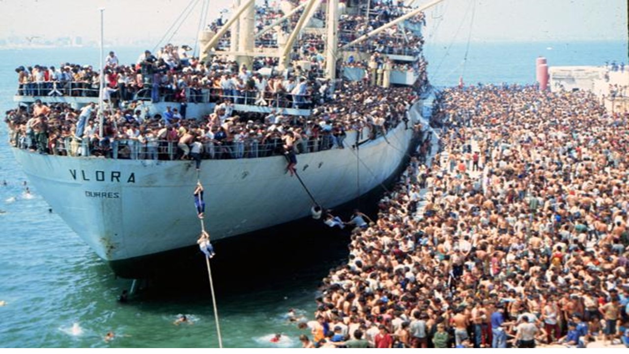Η φωτογραφία αυτή δεν είναι, πράγματι, καθόλου τυχαία. Είναι από τις 7 Αυγούστου του 1991, όταν οι Αλβανοί άρπαξαν για δεύτερη φορά τα πλοία για να φύγουν στην Ιταλία. Η πρώτη φορά ήταν το Μάρτιο. Δεν φαίνεται στη φωτογραφία, αλλά εκεί υπήρχαν δέκα χιλιάδες άνθρωποι. Στο εξώφυλλο είναι η στιγμή που λύνουν το καράβι κι αρχίζει να απομακρύνεται. Εγώ δεν πρόλαβα να μπω. Εκατοντάδες άτομα βούταγαν στη θάλασσα για να προσπαθήσουν να σκαρφαλώσουν πάνω. Εγώ φοβήθηκα μην πνιγώ, γιατί ακόμα μέχρι και σήμερα δεν ξέρω καλό κολύμπι. Μέσα στο χαμό έχασα και τους φίλους μου. Στις 2 τα ξημερώματα επέστρεψα στο σπίτι μου. Η μάνα μου κι ο πατέρας μου δεν ήξεραν τίποτα και στο δρόμο φοβόμουν ότι θα με δείρει ο μπαμπάς μου μόλις θα καταλάβαινε τι είχα κάνει. Είχαν αντιρρήσεις ένα μικρό παιδάκι να φύγει, να κοιμάται στα βουνά, να μην μιλάει τη γλώσσα σε μια ξένη χώρα και να μην έχει ούτε έναν γνωστό. «Γύρισες;» με ρώτησε η μάνα μου μόλις με είδε. Είχε καταλάβει. «Ο πατέρας σου πού είναι;» με ρώτησε. «Ο πατέρας μου;» απόρησα εγώ. Ο πατέρας μου είχε ανέβει σε εκείνο το καράβι και είχε φύγει.