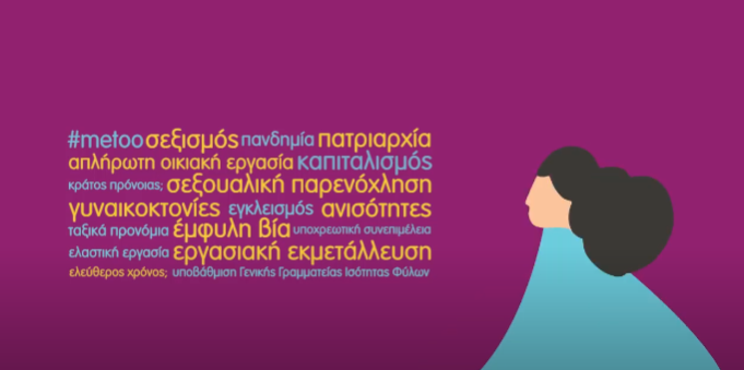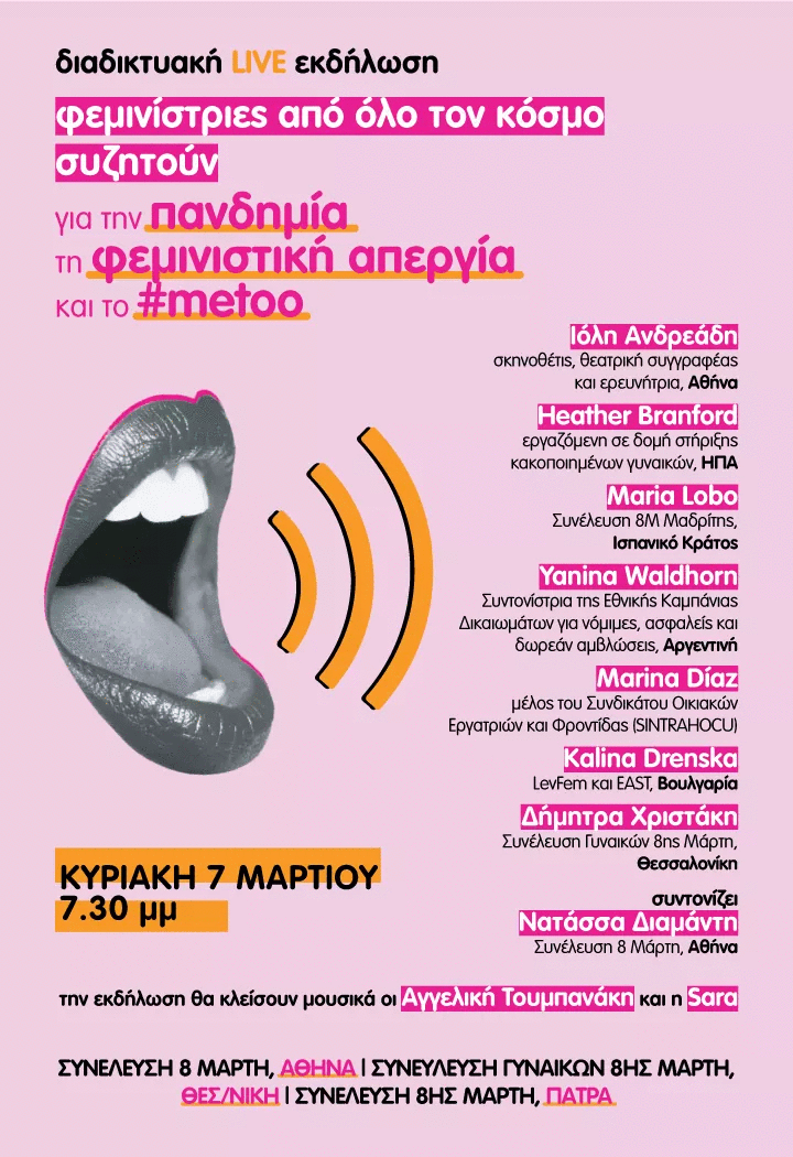 «Με χαρά και φεμινιστική περηφάνια σάς παρουσιάζουμε τη διαδικτυακή εκδήλωση που προετοιμάζουμε για την Κυριακή 7 Μαρτίου στις 19:30, μία μέρα πριν από τη φεμινιστική απεργία.
