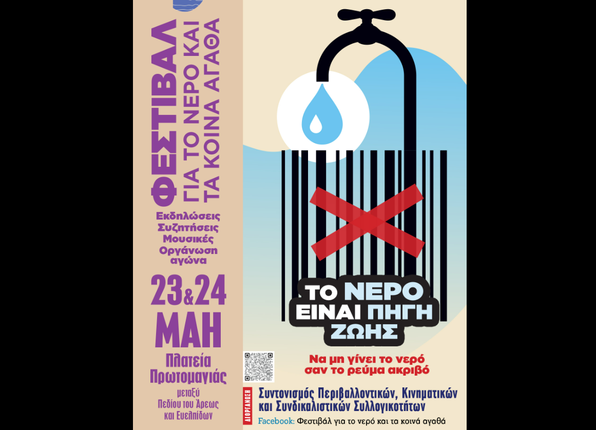Σας περιμένουμε λοιπόν, όλες κι όλους, στις 23 και 24 Μαίου 2025 στο “Φεστιβάλ για το Νερό και τα Κοινά Αγαθά” στο Πεδίο του Άρεως (Πλατεία Πρωτομαγιάς)!