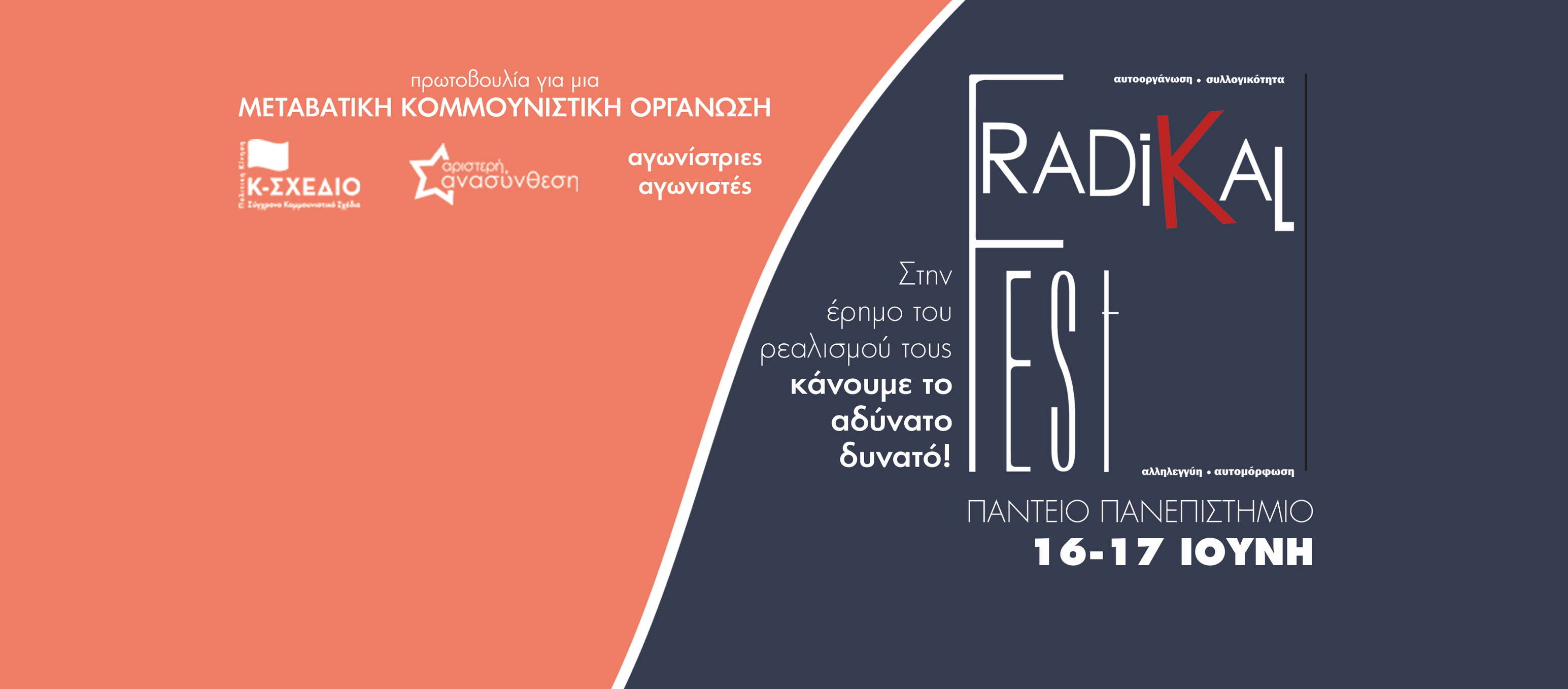 Το φεστιβάλ Radikal διοργανώνεται από τη νεολαία της Αριστερής Ανασύνθεσης, τους/τις νέους/ες για ένα Σύγχρονο Κομμουνιστικό Σχέδιο, οργανώσεις της επαναστατικής ριζοσπαστικής Αριστεράς και ανένταχτους/ες αγωνιστές/-τριες, στο πλαίσιο της αυτοοργάνωσης, της αλληλεγγύης και της συλλογικότητας, σε ένα φεστιβάλ οικονομικά αυτοτελές και ανεξάρτητο από χορηγίες, το οποίο προπαγανδίζεται, θα στηθεί και θα λειτουργήσει από νέο κόσμο που αποτέλεσε και επιδιώκει καθημερινά να αποτελεί οργανικό κομμάτι των κινημάτων και αντιστάσεων της εποχής μας.