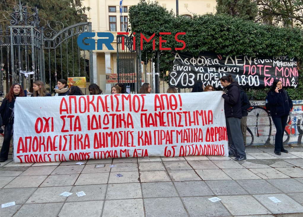Οι φοιτητές έχουν αναρτήσει πανό στις εισόδους του πανεπιστημίου επί των οδών Εγνατίας και Εθνικής Αμύνης. Ο αποκλεισμός των εισόδων θα διαρκέσει έως και τις 12:00.