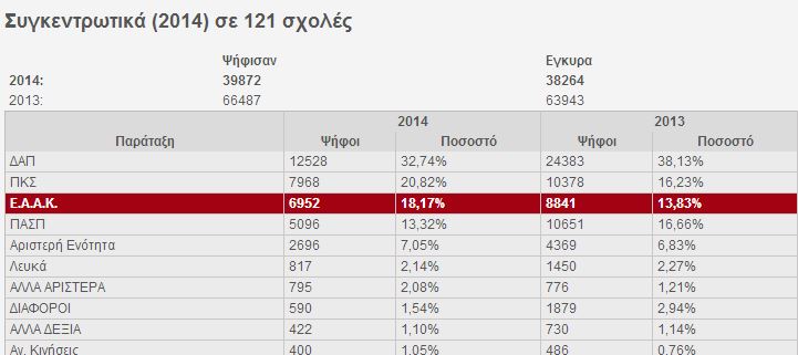 Κάθε παράταξη αναμένεται να εκδώσει τα δικά της αποτελέσματα, ωστόσο, πέρα από την αύξηση της αποχής, αξιοσημείωτη είναι η πτώση της ΠΑΣΠ (ΠΑΣΟΚ), που από το 30% του 2010, πέρυσι έπεσε στο 16.23% ενώ φέτος φαίνεται να πέφτει κι άλλο. Σημειωτέον ότι την τελευταία διετία μέρος της ΠΑΣΠ αποχώρησε και έφτιαξε άλλες παρατάξεις ανά σχολή ή ανά πόλη.