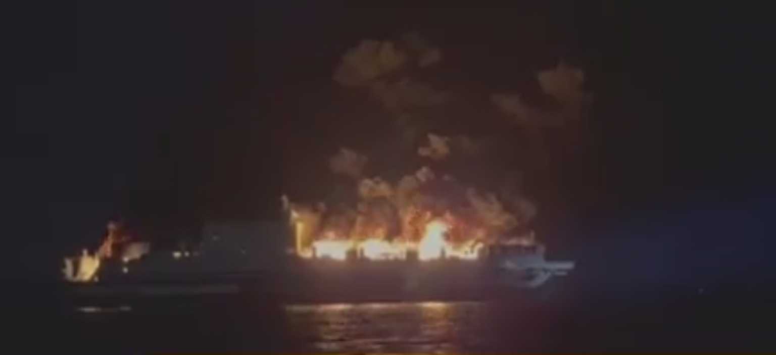 Η πυρκαγιά που ξέσπασε από άγνωστη μέχρι στιγμής αιτία στο κατάστρωμα 3 του επιβατηγού-οχηματαγωγού πλοίου Euroferry Olympia, λίγη ώρα μετά τον απόπλου από την Ηγουμενίτσα με προορισμό το Πρίντεζι, καίει ανεξέλεγκτη καθώς δεν έχουν φτάσει ακόμα τα πλωτά πυροσβεστικά μέσα.