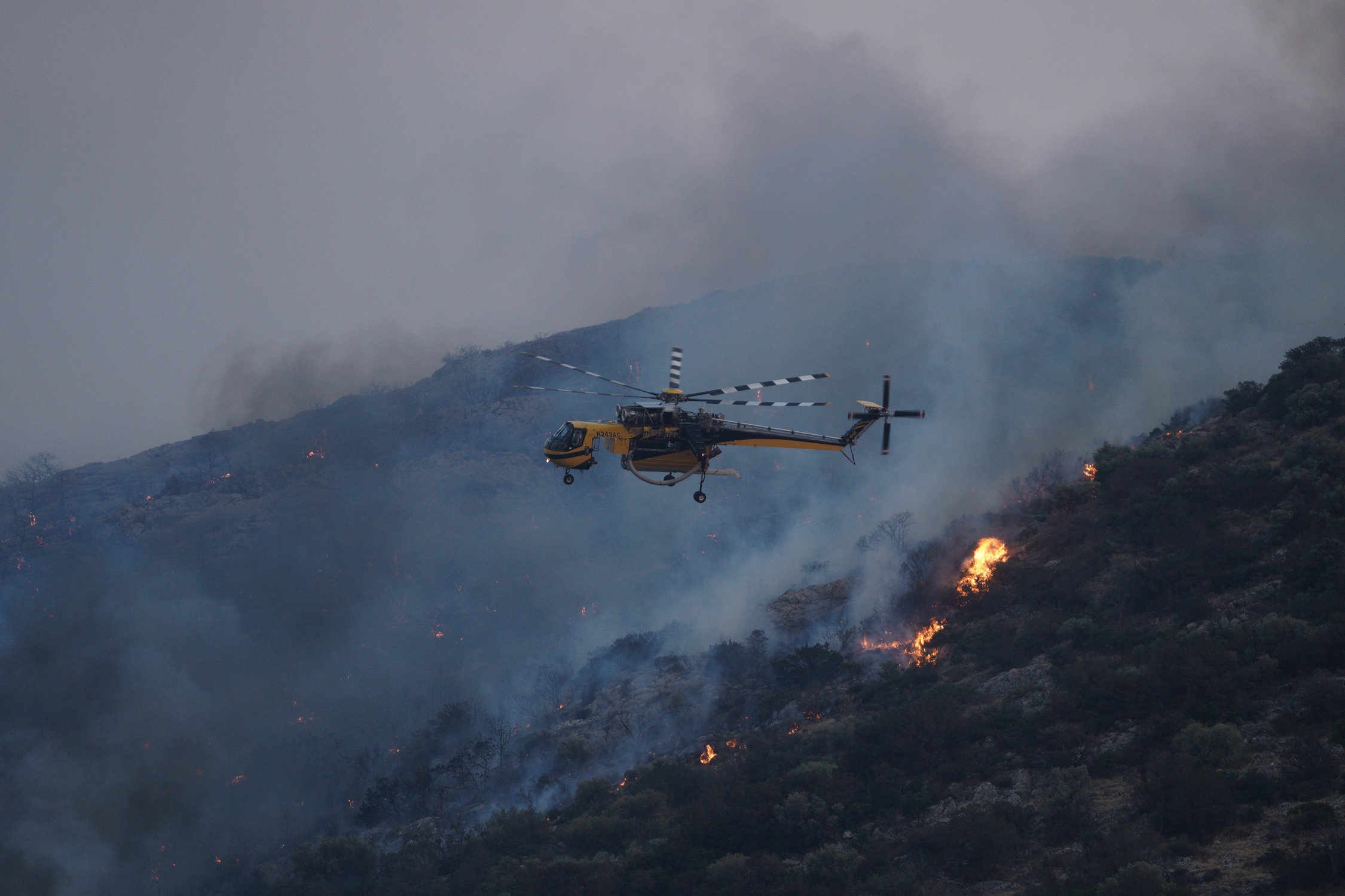 Κοντά στο μέτωπο βρίσκονται σπίτια, όμως η Πυροσβεστική αναφέρει ότι οι οικίες δεν κινδυνεύουν από τις φλόγες.