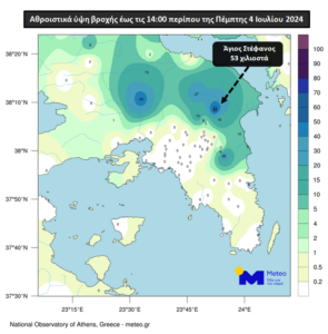 Σύμφωνα με το meteo.gr, από την κακοκαιρία, μέχρι τις πρώτες μεσημεριανές ώρες της Πέμπτης, επηρεάστηκαν κυρίως τα βόρεια τμήματα του νομού. Στην εικόνα που δημοσιεύτηκε παρουσιάζονται τα ύψη βροχής που κατέγραψαν οι σταθμοί του δικτύου αυτόματων μετεωρολογικών σταθμών του meteo.gr / Εθνικού Αστεροσκοπείου Αθηνών έως τις 14:00 περίπου.