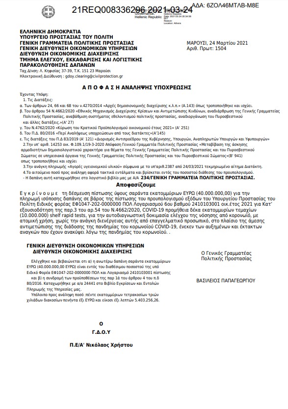 Το παζλ της νυχτερινής προκήρυξης μίας τόσο σπουδαίας -κατά την κυβέρνηση- πρωτοβουλίας συμπληρώνεται από την «Απόφαση Ανάληψης Υποχρέωσης» που δημοσιεύτηκε επίσης μέσα στη νύχτα στο Εθνικό Σύστημα Ηλεκτρονικών Δημόσιων Συμβάσεων (Προμηθεύς), με την οποία ανακοινώνεται πως εγκρίνεται η δέσμευση πίστωσης ύψους 40.000.000 ευρώ για την πληρωμή των 10.000.000 τεστ, γεγονός που σημαίνει πως το τεμάχιο εκτιμάται σε τιμή 4 ευρώ.