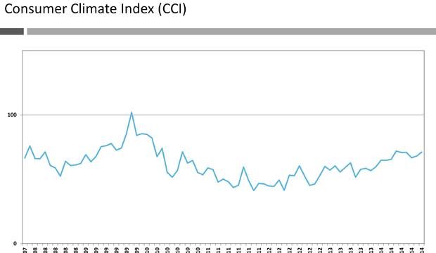 The Consumer Climate Index – CCI (71.2) reached its third highest level in the period since the signing of the Memorandum (5/2010-10/2014), rising significantly (+3.3 points) relative to the previous month. The current value of the index is surpassed only by the historic high of the “Memorandum period” (72) which was recorded in April and the value registered in August 2010 (71.4).