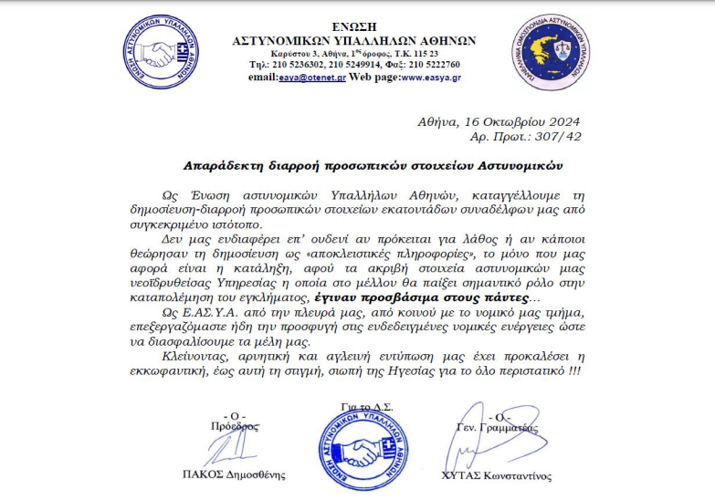 Συγκεκριμένα, επεσύναψε σχετική ανακοίνωση της Ένωσης Αστυνομικών Υπαλλήλων Αθηνών (Ε.ΑΣ.Υ.Α), η οποία καταγγέλλει «τη διαρροή των προσωπικών δεδομένων εκατοντάδων αστυνομικών -και μάλιστα της ειδικής μονάδας που έχει συσταθεί να αντιμετωπίσει το οργανωμένο έγκλημα! Οι αστυνομικοί που είδαν τα προσωπικά δεδομένα τους να διαρρέουν στους πάντες, δηλώνουν ότι επεξεργάζονται ενδεδειγμένες νομικές ενέργειες, ώστε να προσφύγουν κατά παντός υπευθύνου».