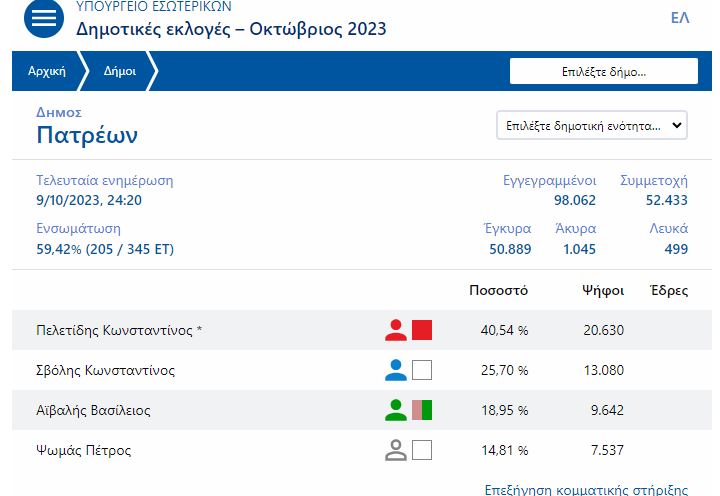 Ο κ. Πελετίδης, με καταμετρημένο το 33% των ψήφων, συγκεντρώνει ποσοστό 41,31%. Ο Κωνσταντίνος Σβόλης 25,16% και ο Βασίλειος Αϊβαλής 18,46%.