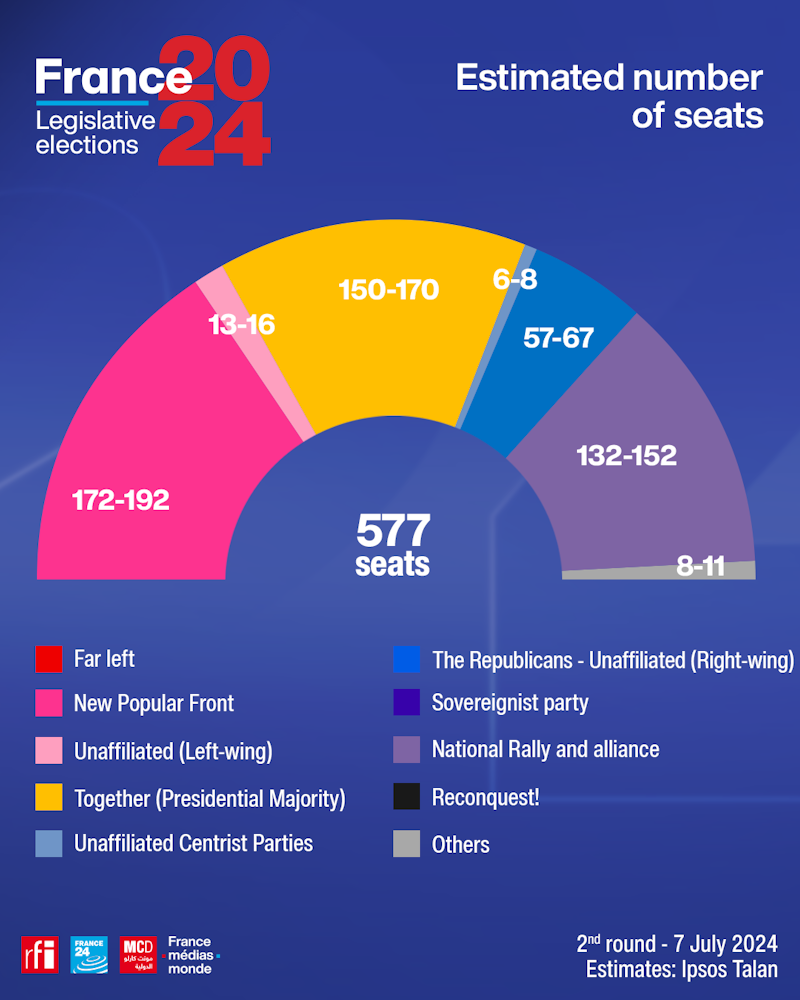Σύμφωνα με τις πρώτες εκτιμήσεις ο αριστερός συνασπισμός θα καταλάβει 172 – 192 έδρες, το «Μαζί» του Μακρόν 150 – 170 έδρες και η Λεπέν μόλις 132 – 152.