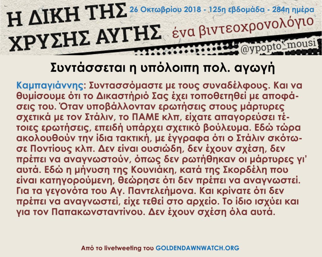 Μέσα στις δύο εβδομάδες που μας πέρασαν (124η και 125η), η δίκη της Χρυσής Αυγής ως εγκληματικής οργάνωσης συνεχίστηκε με 6 συνολικά δικασίμους. Κατά τις ημέρες αυτές, συνεχίστηκε η ανάγνωση δεκάδων κοινοβουλευτικών ομιλιών και επερωτήσεων των κατηγορουμένων, τις οποίες προσκομίζουν οι δικηγόροι των χρυσαυγιτών, χρησιμοποιώντας το δικαίωμα της υπεράσπισης. Σε ενάμιση μήνα έχουν παραδοθεί αναγνωστέα έγγραφα μόνο για τους 13 από τους 68 κατηγορούμενους.