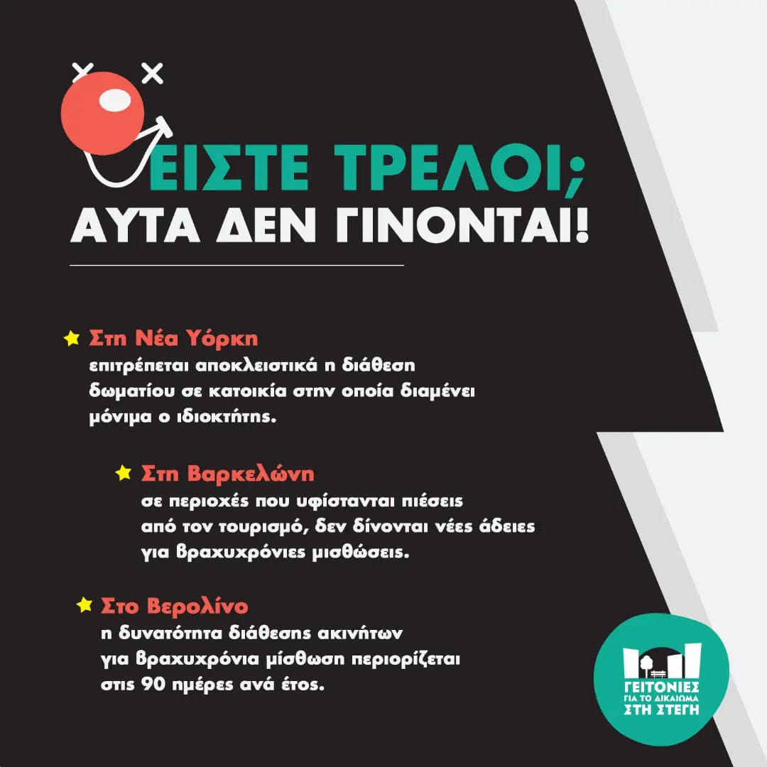 - Περιορισμός/ Απαγόρευση των βραχυχρόνιων μισθώσεων (τύπου AirBnB) – Σπίτια για τους κατοίκους και όχι για τους τουρίστες