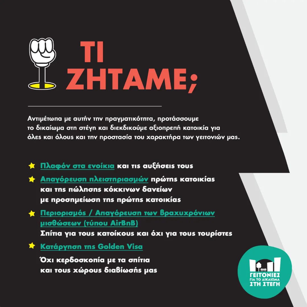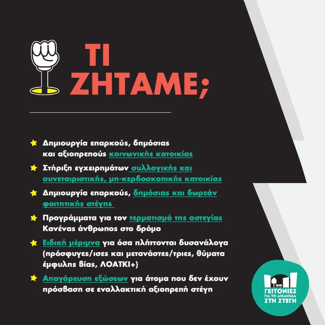 «Όλα μας έχουμε βιώσει την απώλεια στέγης, είτε δικιάς μας, είτε φίλων και συγγενών μας. Έχουμε χάσει τα σπίτια μας, τις γειτόνισσες μας, τη βάση μας, καθώς κάτοικοι εκτοπίζονται και γειτονιές αποσυντίθενται. Για αυτό μαζευόμαστε το Σάββατο 6 Απριλίου στο Θησείο να διαμαρτυρηθούμε κάνοντας μια: