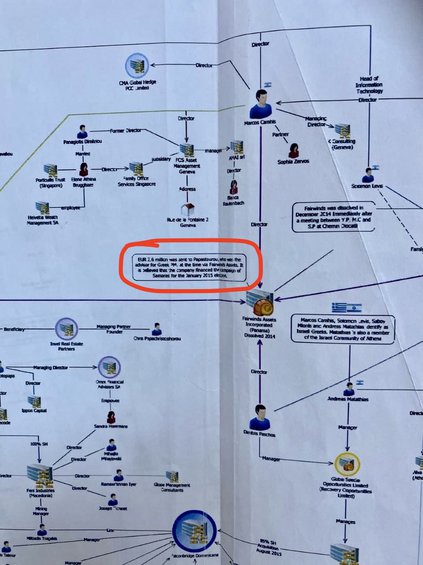 Μάλιστα, κατά τη διαρροή των εγγράφων στον Τύπο, προκύπτει σχεδιάγραμμα για το πως ποσό 2,6 εκατ. ευρώ που είχαν σταλεί από την εταιρία Fairwinds assets του Παναμά, στον Σταύρου Παπασταύρου, την περίοδο που ήταν σύμβουλος του Αντώνη Σαμαρά, τα οποία φέρονται στην πραγματικότητα να χρησιμοποιήθηκαν για την προεκλογική καμπάνια του πρώην πρωθυπουργού τον Ιανουάριο του 2015.