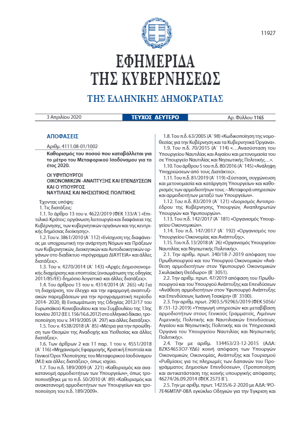 Ακολουθεί το ΦΕΚ με το απόφαση για το «μεταφορικό ισοδύναμο»: