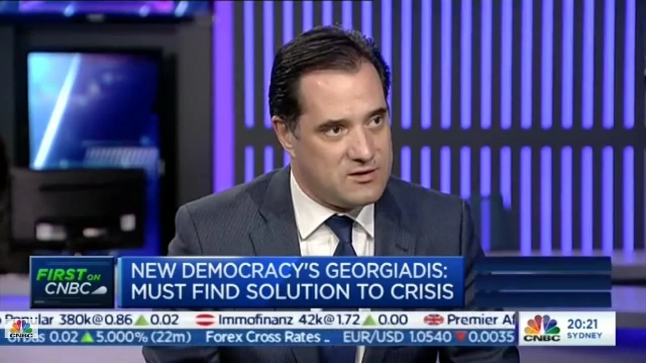 Ο Άδωνις Γεωργιάδης βρέθηκε στο στούντιο του αμερικανικού δικτύου CNBC, συνομιλώντας με τις δύο παρουσιάστριες, τόσο για την παρούσα κατάσταση στην Ελλάδα, όσο και για τις προθέσεις της Νέας Δημοκρατίας, στην περίπτωση που μετά τις επόμενες εκλογές αναλάβει τη διακυβέρνηση της χώρας. Ο αντιπρόεδρος της Νέας Δημοκρατίας, όχι μόνο δικαιολόγησε τη στάση των δανειστών έναντι της χώρας, αλλά μέμφθηκε τον Αλέξη Τσίπρα επειδή «στοχοποιεί» το ΔΝΤ και τον Βόλφγκανγκ Σόιμπλε.