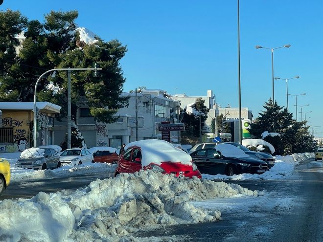 Δρόμοι ακόμη και μέσα στις γειτονιές του κέντρου της Αθήνας παραμένουν απροσπέλαστοι είτε γιατί ακόμη δεν έχει περάσει κανένα μηχάνημα για να απομακρύνει τον όγκο του χιονιού είτε γιατί το χιόνι λόγω της χαμηλής θερμοκρασίας έχει μετατραπεί σε πάγο.