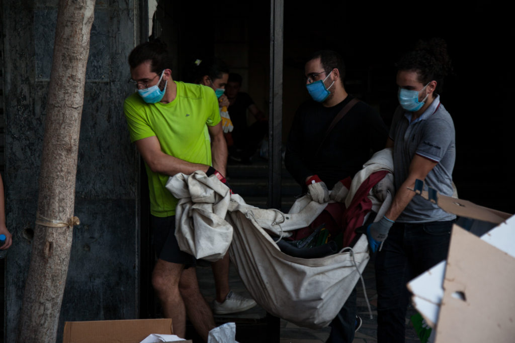 Ο κύριος Ρέμι είναι η πόλη του. Τα παιδιά που σηκώνουν κουρνιαχτό φτυαρίζοντας είναι και αυτά η πόλη του. Ο Χασάν, που αφήνει για λίγο το φτυάρι για να μου πει ότι είναι φοιτητής, όχι εργαζόμενος όπως βιάστηκα να συμπεράνω. «Θα ήθελα να δουλεύω αλλά δεν υπάρχουν δουλειές». Θυμωμένος με τους πολιτικούς αλλά «τώρα είναι εθνική ανάγκη». Το αγόρι που σπουδάζει βυζαντινή μουσική και δε θέλει να μιλήσει ον κάμερα αγγλικά – «δεν είναι καλά τα αγγλικά μου»-, αλλά στεκόμαστε και μιλάμε δέκα λεπτά στη μέση του δρόμου. Είναι από το βόρειο Λίβανο, έρχεται να βοηθήσει. «Ερχόμαστε από παντού, είναι ανάγκη να βοηθήσουμε». Σπουδάζει βυζαντινή μουσική, πόσο αγαπάει την Ελλάδα! «Καλησπέρα!». Το λέει ελληνικά. Και φεύγει με τους φίλους του, γελαστός – μας ευχαριστεί! Οπως και το κορίτσι με τη σημαία, η Τζενάν. «Σας ευχαριστούμε που είστε εδώ, σημαίνει τόσα πολλά για μας!». Που τι; Που προσφέρουμε την παρηγορία ότι ο κόσμος νοιάζεται.. Ο 25χρονος νέος άντρας με το ιατρικό κολλάρο στο λαιμό. «Ήμουν στο λιμάνι, δούλευα. Δεν κατάλαβα τι έγινε. εκεί που όλα ήταν ήσυχα, ξαφνικά φουπ!», ανοίγει τα χέρια του. Σκέπτομαι πόσο ντροπαλός είναι. Μου λέει σεμνά, τόσο ήσυχα, απαλά και σεμνά «δεν είναι μόνο ο λαιμός, ξέρεις, έχασα και την ακοή μου από εδώ», από το δεξί του αυτί. Συνειδητοποιώ ότι είναι εκατοντάδες οι άνθρωποι που θα έχουν πάθει το ίδιο, που θα κουβαλούν σημάδια από αυτή την έκρηξη όλη τους τη ζωή – όχι μόνο τα κοινά σημάδια, όχι, και από τα άλλα, τα απολύτως προσωπικά.