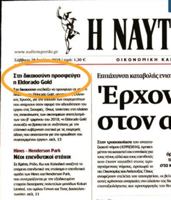 Ειδική αναφορά αξίζει στο άρθρο της Λέττας Καλαμαρά στη «Ναυτεμπορική», όπου το «αξιολογεί τις νομικές επιλογές της» διαστρεβλώθηκε και έγινε πρωτοσέλιδη δήθεν «είδηση»: «Στη δικαιοσύνη ΠΡΟΣΦΕΥΓΕΙ η Eldorado Gold»! Πιασάρικος ο τίτλος αλλά απολύτως ψευδής. Ένα γνήσιο fake news. Προσπαθεί να δημιουργήσει «κλίμα» η κα Καλαμαρά;