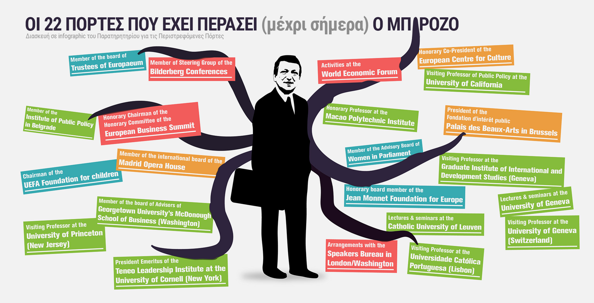 Ο καλύτερος όμως όλων είναι ο Ζοσέ Μανουέλ Μπαρόσο, πρόεδρος της Κομισιόν από το 2004 μέχρι το 2014, στο διάστημα δηλαδή που οι χώρες του ευρωπαϊκού Νότου αντιμετώπισαν πρωτοφανείς στη σύγχρονη ιστορία τους κρίσεις, που αντιμετωπίστηκαν από τους δανειστές τους με πολιτικές που είχαν θύματα εκατομμύρια ανθρώπους. Όταν τελείωσε η θητεία του, ο Μπαρόσο μετακινήθηκε στην Goldman Sachs, την τράπεζα που είναι από τους βασικούς υπαιτίους και της παγκόσμιας αλλά και της ελληνικής κρίσης. Να θυμίσουμε απλά ότι όπως έχει ξαναναφέρει το TPP, η Goldman υπέγραφε με την Ελλάδα «Συμβάσεις ανταλλαγής κινδύνου αθέτησης (credit default swap CDS), ενώ παράλληλα σημαντικά στοιχεία, όπως οι στρατιωτικές δαπάνες, έμεναν τακτικά έξω από την μέτρηση του ετήσιου ελλείμματος. Η Ελλάδα δεν είναι μόνη υπαίτιος γι αυτό, καθώς η Ευρώπη, μέσω της Eurostat, ενέκρινε αυτούς τους πλασματικούς αριθμούς.