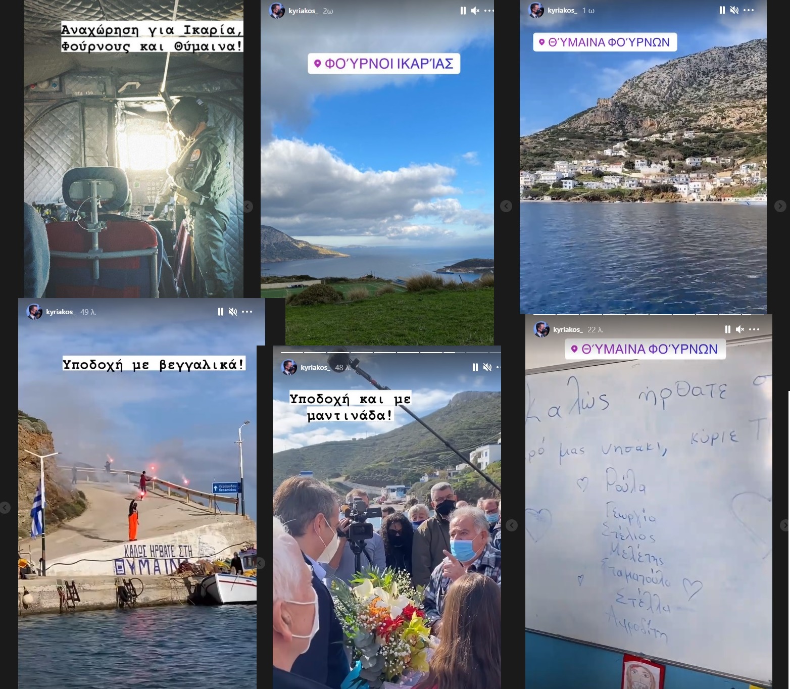 Στις φωτογραφίες που δημοσίευσε ο πρωθυπουργός, όπου με πολλούς τόνους lifestyle παρουσιάζει διάφορα «στάδια» του ταξιδιού, εμφανίζεται μεταξύ άλλων ανάμεσα σε αρκετούς κατοίκους του νησιού που συγκεντρώθηκαν για να τον υποδεχθούν, ακόμα και χωρίς να τηρούνται οι αποστάσεις. Υπενθυμίζεται πως στο νησί όπου βρέθηκε η πολυπληθείς πρωθυπουργική αποστολή, τα καταγεγραμμένα κρούσματα είναι ελάχιστα.