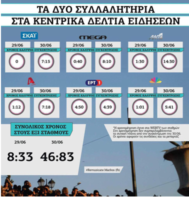 This chart shows you how much time was afforded the two demonstrations on each of the major TV networks, the 5 larger private ones (SKAI, MEGA, ANT1, STAR & ALPHA) and the central public broadcaster (ERT1). You will notice that everywhere but the public broadcaster there is a distinct difference in coverage time. The “No” demonstration was under-covered in all private TV networks’ central news broadcasts, ranging from four and a half minutes less on STAR News, to twelve minutes less on ANT1 News and with SKAI offering the “No” supporters not even a few seconds of coverage. In total, you can notice that the “Yes” demonstration was covered more than 5 times as much as the “No” one.