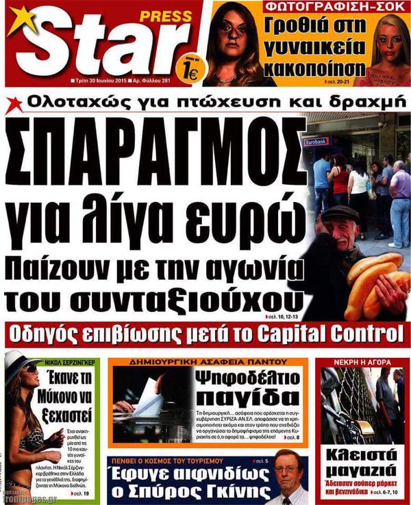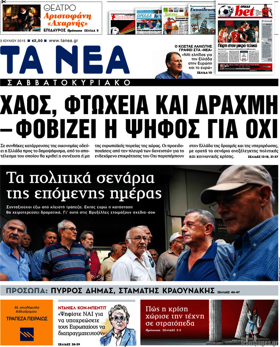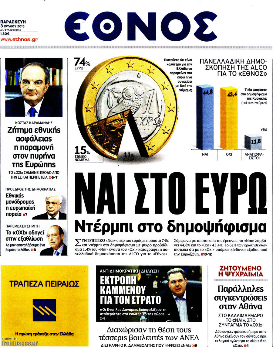 Το ίδιο ισχύει και για τις μεγάλες «έγκυρες» εφημερίδες των δύο μεγάλων και «γνωστών» δημοσιογραφικών Ομίλων. Παρακάτω δείτε δύο σημερινά πρωτοσέλιδα. Τα «ΝΕΑ» στο κλίμα των καναλιών «μοιράζει» φόβο. Το «ΈΘΝΟΣ» προσπαθεί να μας πείσει για το αποτέλεσμα του δημοψηφίσματος:
