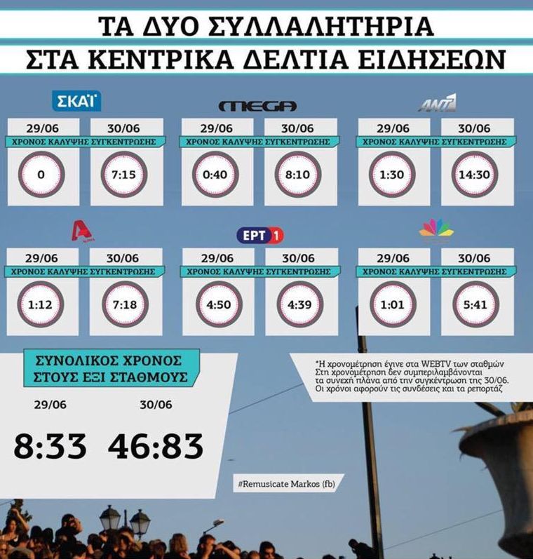 Για τις προηγούμενες συγκεντρώσεις υπέρ του «ΟΧΙ» και του «ΝΑΙ» η «δημοσιογραφική» κάλυψη ήταν αποκαλυπτική. Ο χρόνος που αφιερώθηκε για τις συγκεντρώσεις είναι μάρτυρας: